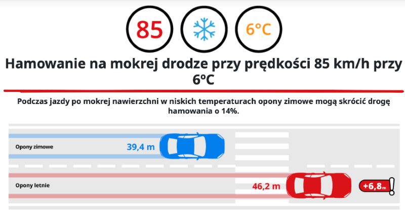 Różnica w drodze hamowanie to 7 metrów na korzyść opon zimowych. To są prawie 2 długości małego SUVa!