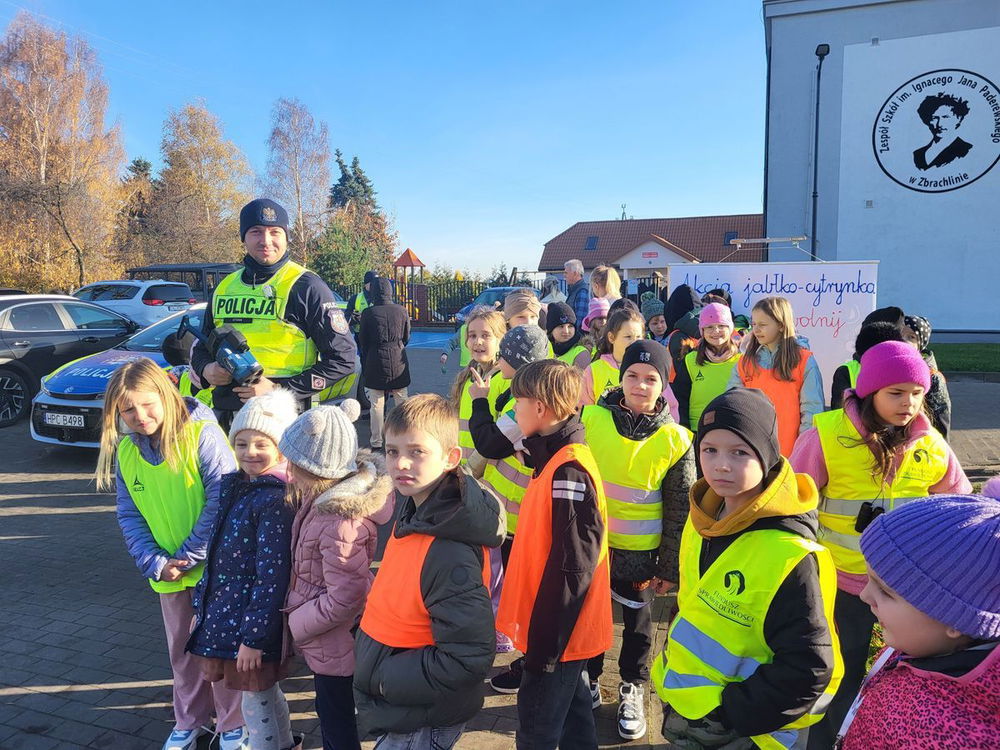 Policjanci aleksandrowskiej drogówki wspólnie z uczniami Szkoły Podstawowej w Zbrachlinie przeprowadzili akcję edukacyjną mającą zwrócić uwagę na bezpieczeństwo ruchu drogowego w rejonie szkoły.