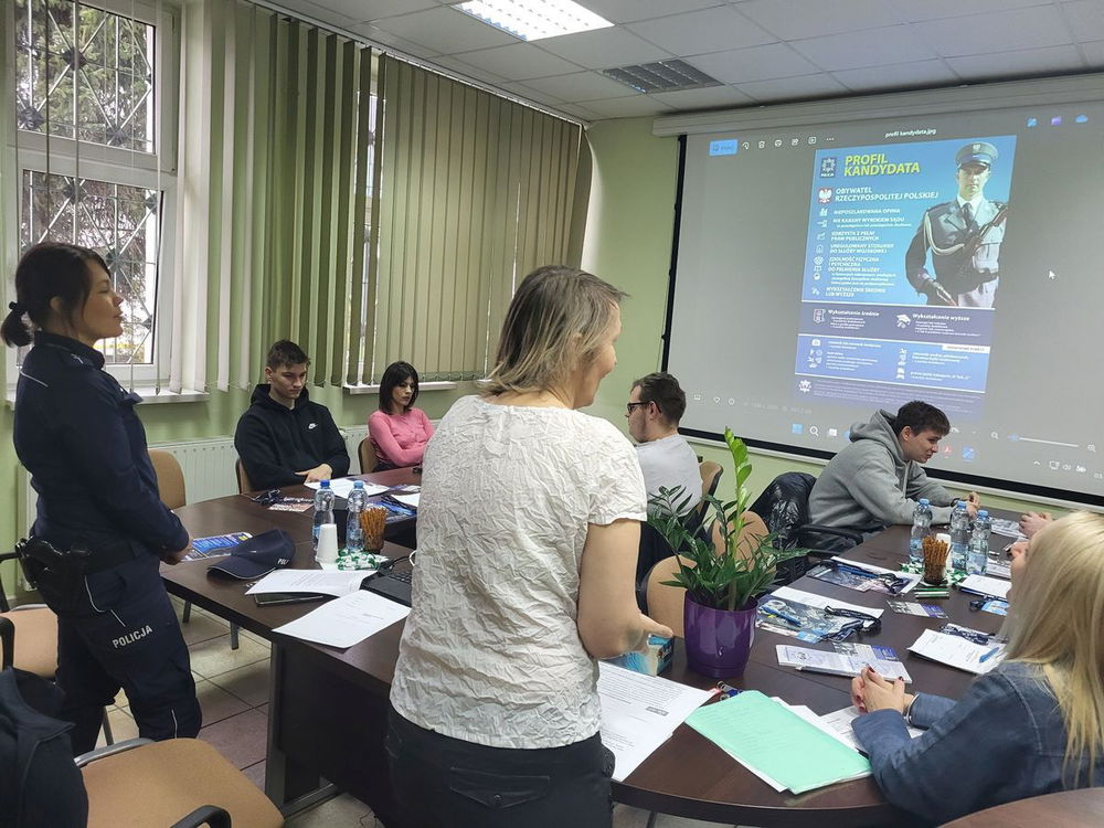 W Powiatowym Urzędzie Pracy w Aleksandrowie Kujawskim policjanci wraz z pracownikiem zespołu kadr i szkolenia zaprosili osoby zainteresowane służbą w Policji. Podczas spotkania przedstawiono profil kandydata oraz szczegóły procesu rekrutacji niezbędne do wcielenia do służby.